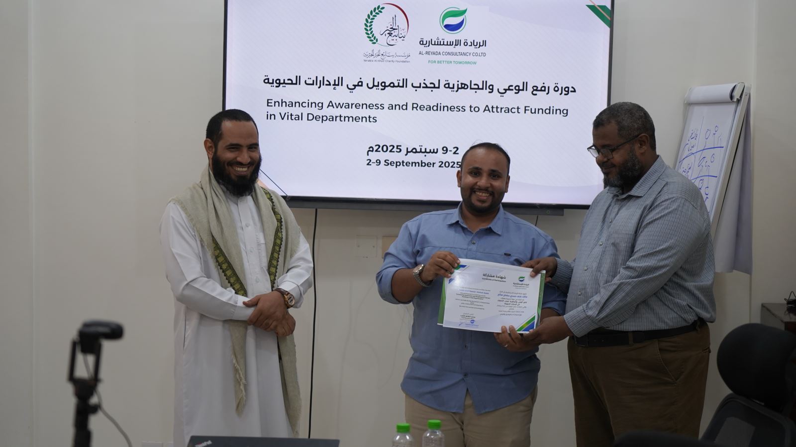 اختتمت شركة الريادة الاستشارية، بالتعاون مع مؤسسة ينابيع الخير الخيرية (YKF)، ورشة عمل تدريبية بعنوان "رفع الوعي والجاهزية لجذب التمويل في الإدارات الحيوية"، والتي استمرت على مدى خمسة أيام وبواقع 20 ساعة تدريبية، بمشاركة موظفي الإدارات المعنية في المؤسسة.